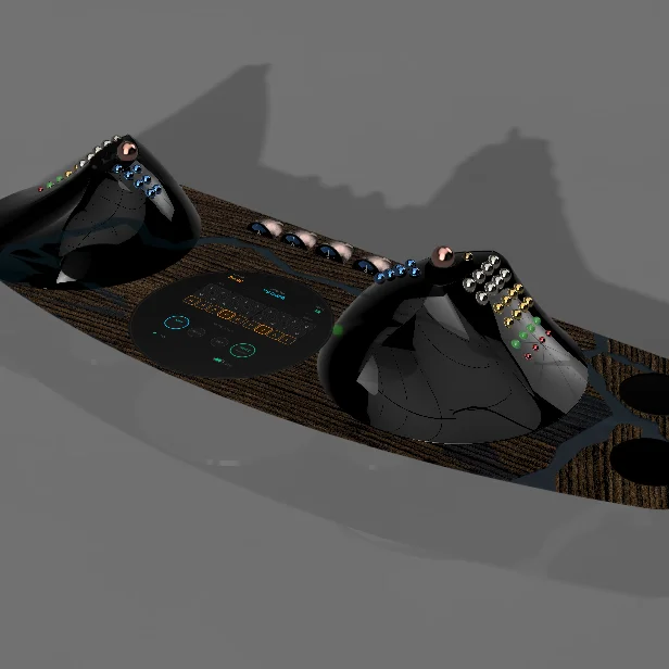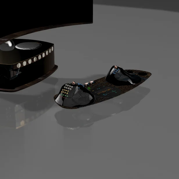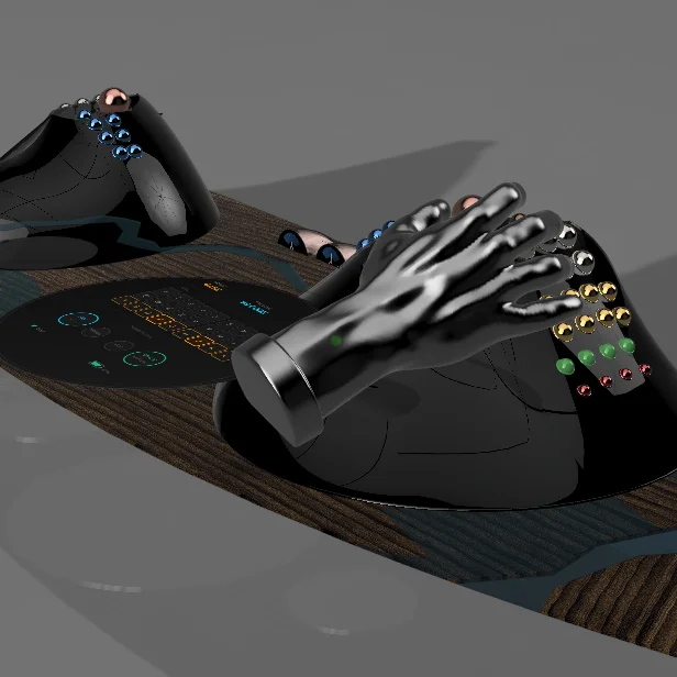 The world's first zero-movement input system. Hands rest on palm mounts. Fingers tilt balls through positions. Thumb controls 6DOF space ball + space key. Open mesh frame, bean-filled leather palm rest. 12 balls total, fully programmable.